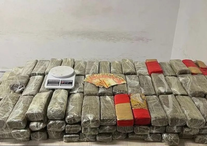 Um dos suspeitos entrou em luta corporal com um policial e foi detido em seguida. Ao vistoriar a casa, foram encontrados quatro sacos de estopa com 146 tijolos de maconha, além de R$ 560 e uma balança.
