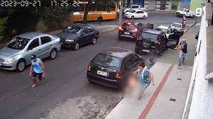As imagens mostram o momento em que a criança é atingida. O alvo dos bandidos estava na calçada, mexendo no carro, e aparece no vídeo com uma camiseta azul.