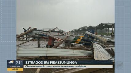 Um temporal de 15 minutos causou estragos em Pirassununga (SP) na tarde de quinta-feira (26). A forte chuva danificou hangares e aeronaves na Academia da Força Aérea (AFA). Ninguém ficou ferido.A chuva de granizo foi suficiente para destruir parte dos galpões da Esquadrilha da Fumaça. O g1 entrou em contato com a Força Aérea Brasileira (FAB) e aguarda um posicionamento sobre os danos.Segundo o coordenador da Defesa Civil, Carlos Eduardo Alves de Souza, a cidade registrou uma precipitação de cerca de 80 milímetros de chuva e os ventos chegaram a 120 km/h.